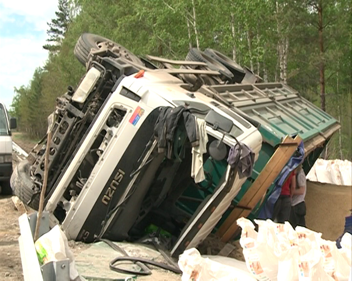 ДТП произошло в Ангарском районе неподалёку от деревни Шароны примерно в 5 часов утра. Грузовик Isuzu, гружёный двадцатью тоннами зерна, ехал из Усолья-Сибирского в сторону Иркутска. Перед ним резко затормозила легковушка. Свернуть в соседний ряд без риска для других участников движения у водителя возможности не было, поэтому он направил машину в отбойник. Грузовик протаранил ограждение и улёгся на бок.