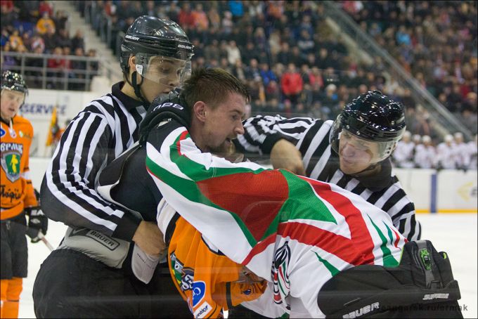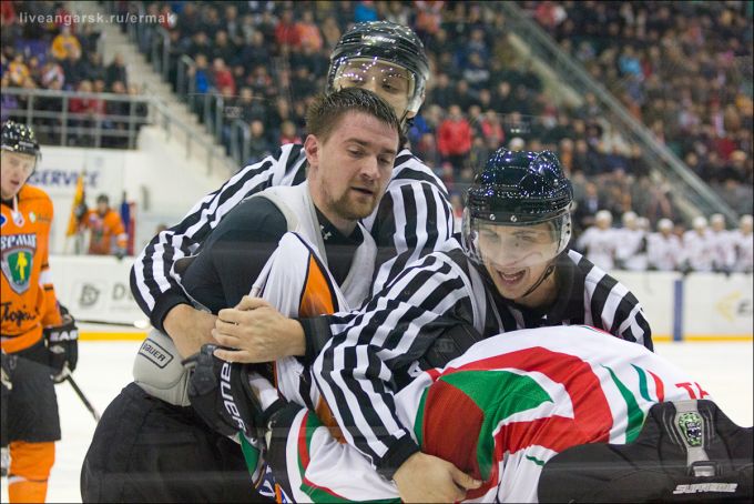 Судейство обсуждать не принято, но сегодня компетентность судейской бригады, думаю, вызвала немало вопросов, как у ангарских болельщиков, так и у гостей. И как обычно бывает, когда судьи слабо держат в руках нить игры, дело дошло до драки. Николай Золотухин и Константин Костюхин с полминуты лупят друг друга, после чего покидают площадку до конца матча. Вслед за этим в штрафной бокс один за другим садятся сразу двое игроков «Нефтяника». «Ермак» сумел воспользоваться подарком судьбы и снова сократил счет до минимума – с передачи Смирнова бьет Чемерилов – 4:5. На перекур болельщики уходят в приподнятом настроении. Третий период начинаем в большинстве. Есть шанс перехватить инициативу и додавить строптивого экс-вице-чемпиона.