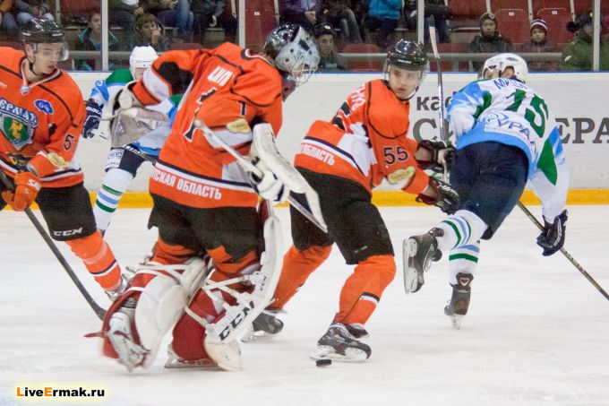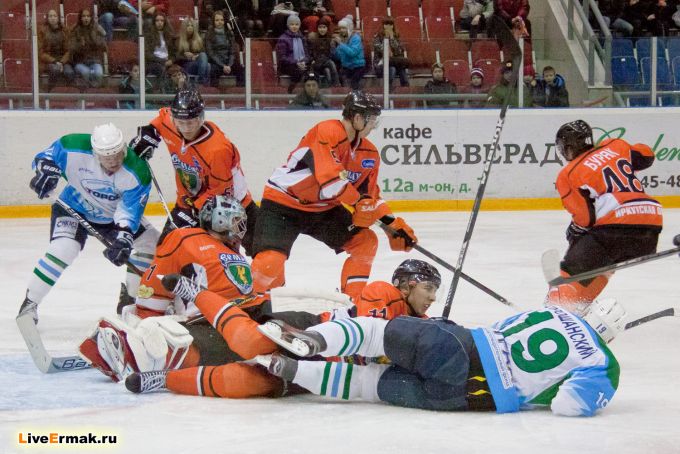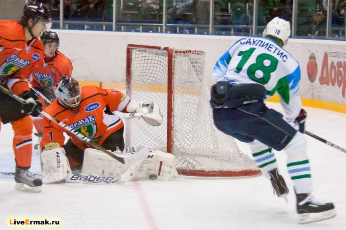 Пятая минута матча и вбрасывание в зоне Ермака! В отличии от других сезонов, выигрывать вбрасывания нам удается. Но не в этот раз! Алексей Гришин эту шайбу лишь сдвинул, а латышский друг башкирского народа Мицкевичс хлестким ударом прошил Шилина. Счет 1:0 и будто так и должно быть...Ермак продолжает свою игру и не прошло трех минут комбинация Тороса и Зимин получив пас на пятак красиво закинул шайбу в ворота Ермака.