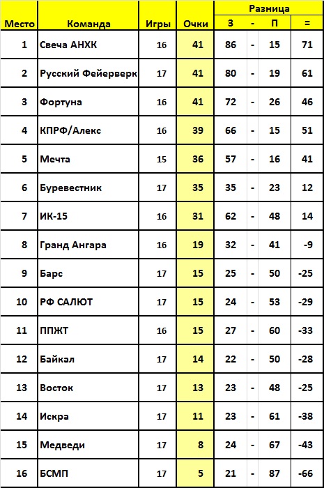 Положение команд после 17 туров