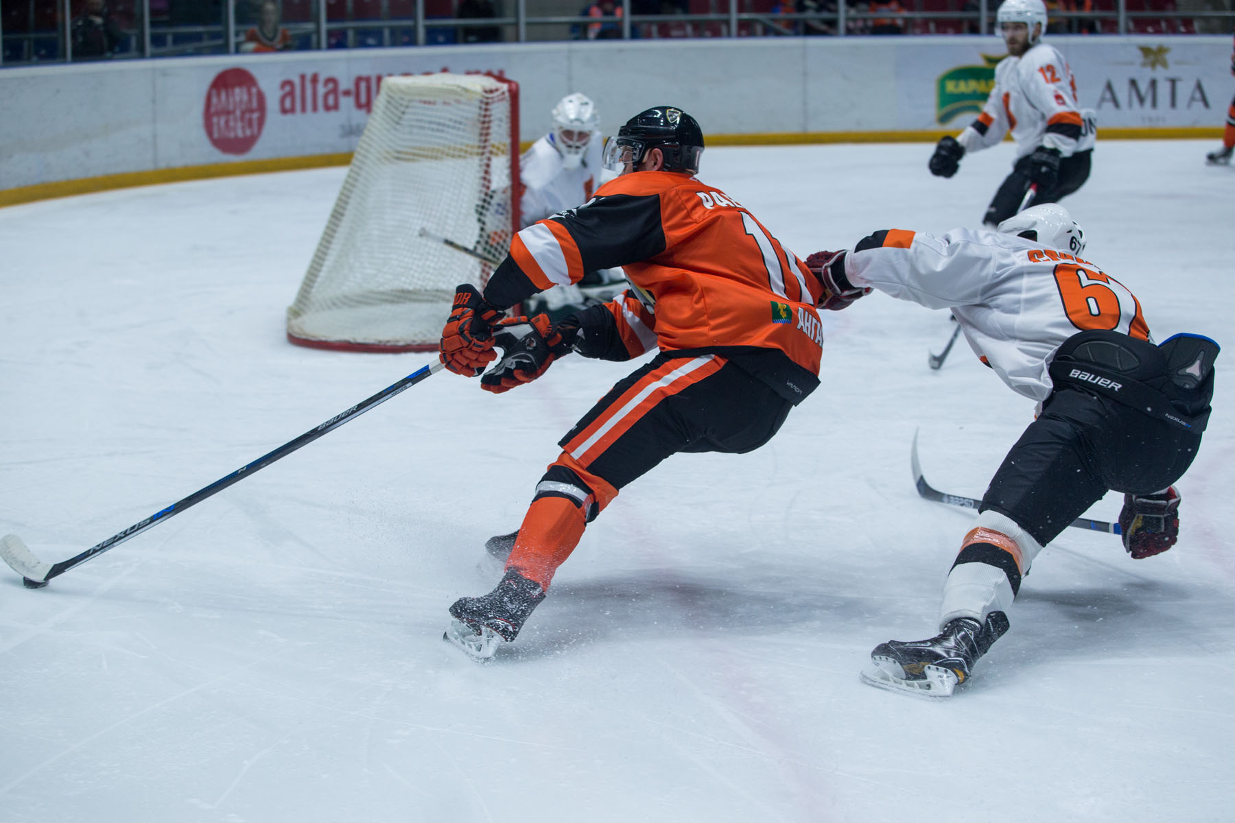 До середины стартового отрезка встречи на площадке не происходило ни-че-го. Кардинально обновлённые тройки форвардов ангарчан пытались нащупать игровые связи, но с непривычки в атаке до поры до времени преобладала игра индивидуальная. Совершил пару попыток обострения наш опытный джокер Раенко, но это была ни к чему не обязывающая проба пера в новом коллективе. Забегая вперёд, выскажу своё мнение, что Анатолий был заметен на площадке, но, по большей части, в первом периоде. Возможно, 11-му номеру ещё предстоит набрать свою лучшую форму, а, может быть, всё дело в банальной адаптации. Время покажет... Игравший в звене с новобранцем капитан, как мне кажется, найдёт общий язык с Раенко. Выходивший же с ними в тройке Дергунов, давненько не попадавший в состав, очень старался, но первый период удался 71-му номеру тоже лучше двух последующих.