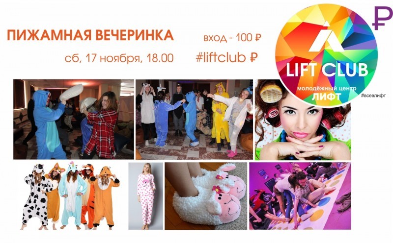 Пижамная вечеринка в "Лифте" ждёт тебя уже 17 ноября! Добро пожаловать на горячий, суперуютный и безбашенный вечер! Начало в 18:00. Прояви фантазию! Пижамы, халаты, кигуруми, огромные мягкие тапки! Будем зажигать под отличную музыку и движ, пока на улице ужасно неприятно. Подробности ЗДЕСЬ.
