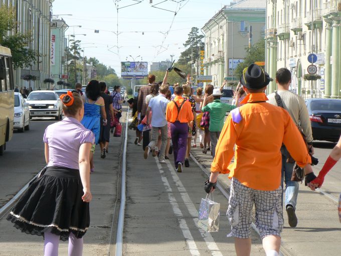 Необычное шествие улыбающихся людей в разноцветной одежде было замечено в эту субботу на улице Горького в Ангарске.