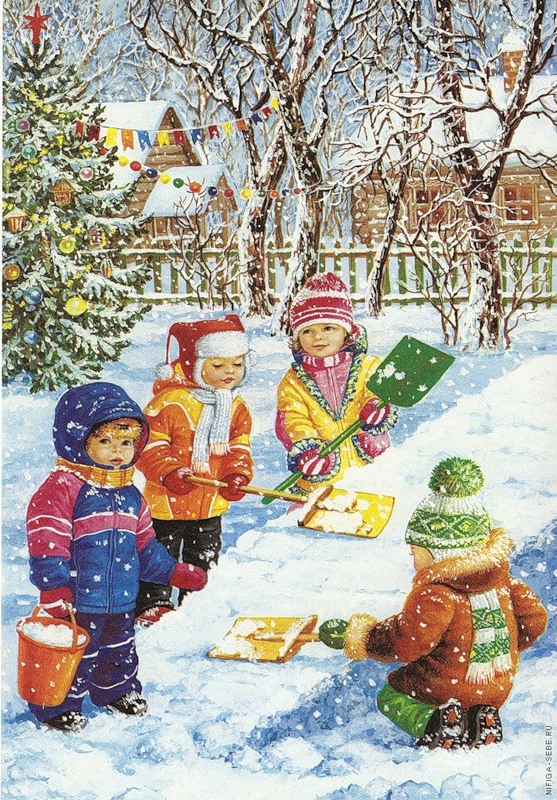 - горки, санки, коньки, снеговики, лыжи....