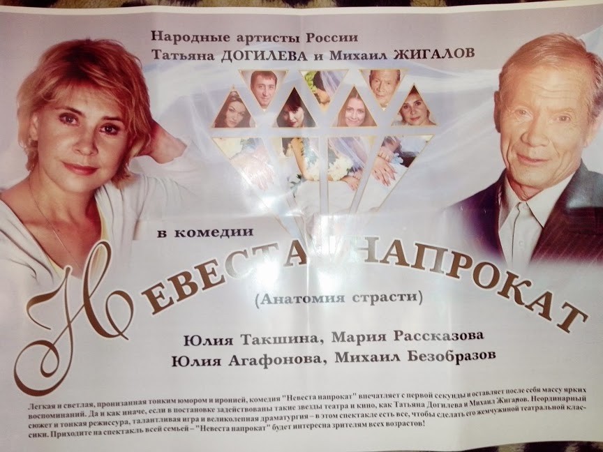 Не мешайте всё в одну кучу. Здесь не обсуждается пьеса "Невеста напрокат", а речь идёт о хитромудрой замене спектакля, ведь только для ангарских и иркутских зрителей в афишке "Невесты напрокат" в скобочках подписано"Анатомия страсти". В сети есть афиши этой "Невесты..." для других городов и там никаких скобочек с добавлением "Анатомия страсти" нет.