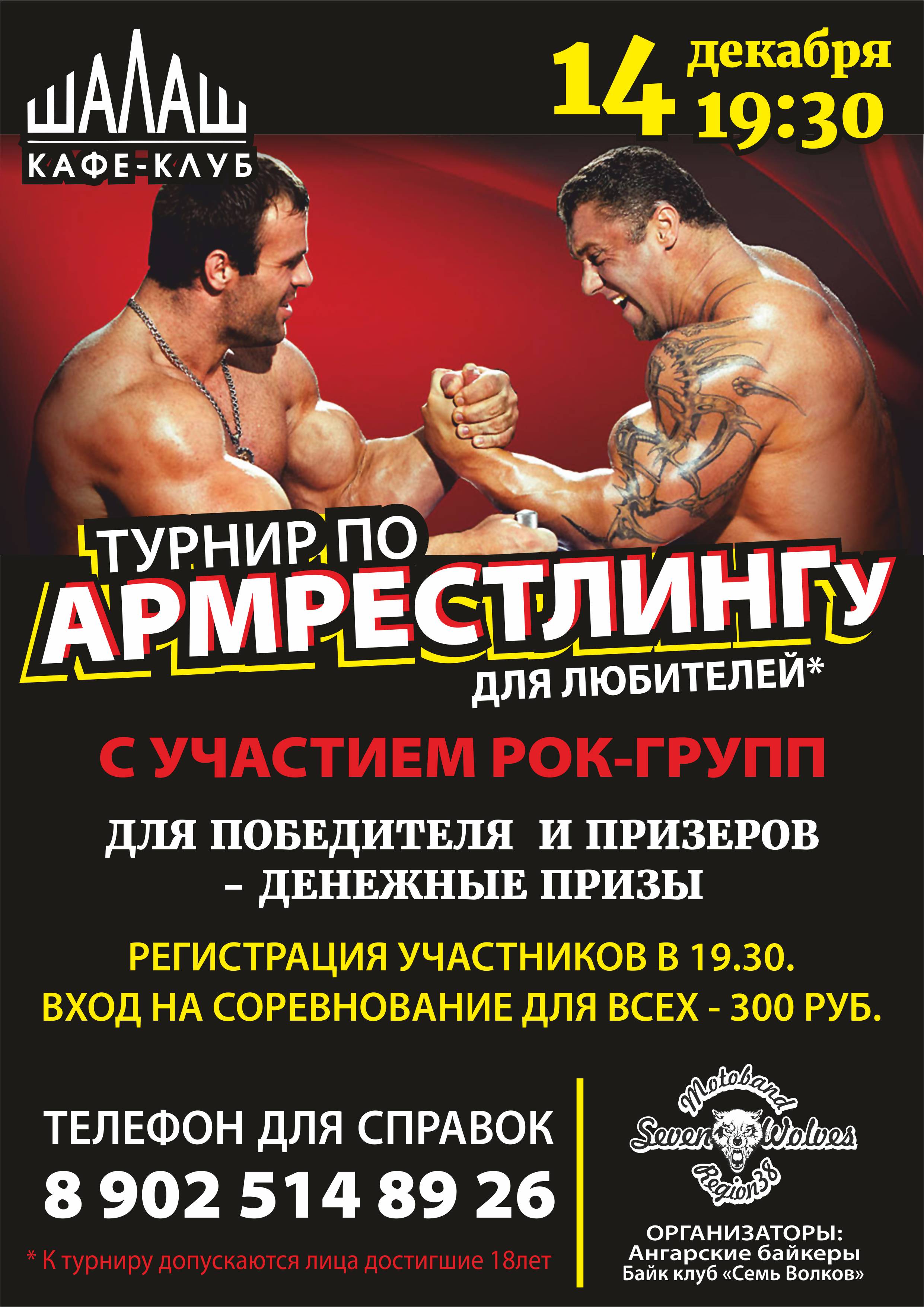 14 декабря в кафе-клубе "Шалаш" (7 м-он, стр. 8а) пройдет турнир по армрестлингу для любителей. Регистрация участников начнется в 19:30, начало турнира - в 20:00.
