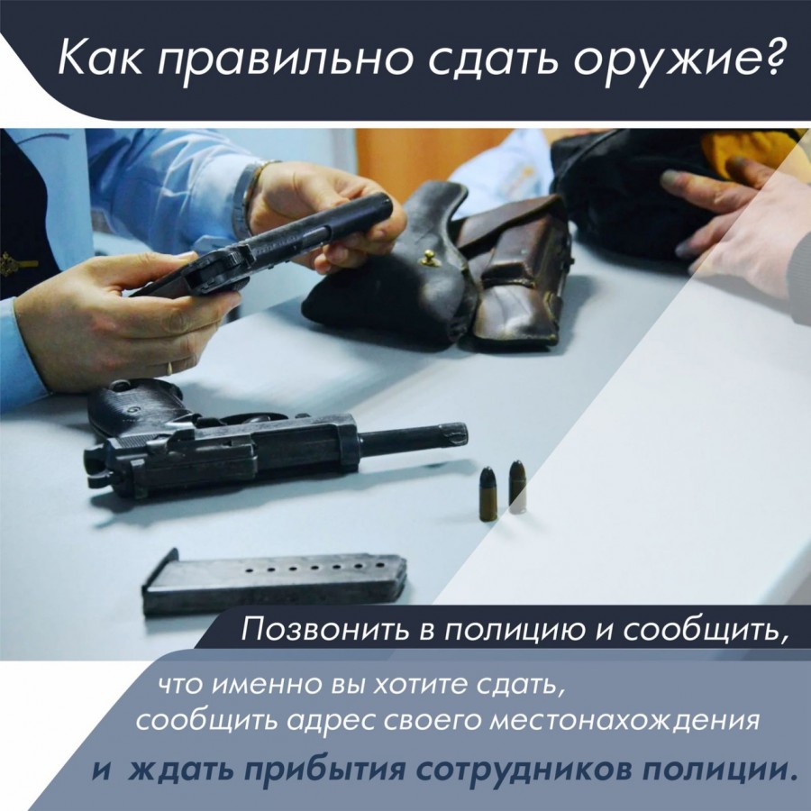 За пять лет в полицию обратились свыше 1 тысячи жителей Приангарья с заявлениями о добровольной сдаче огнестрельного и газового оружия, а также боеприпасов и взрывчатых веществ, получив свыше 6,5 миллионов рублей. Благодаря действиям законопослушных граждан сдано более 900 единиц гладкоствольного и нарезного оружия и около 100 тысяч боеприпасов.